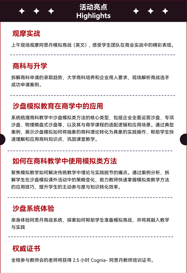 当传统的案例教学逐渐触及天花板,当学生的升学与成长路径需要我们提供更具说服力的“能力凭证”,我们深知,是时候共同探索一种更贴近时代、更赋能学生的教育新范式了。在此,阿思丹发起模拟商战教练计划 ABS Coach Plan,并举办经济学及商科教师研讨会。结合阿思丹模拟商战现场,为老师们提供一个深入了解商学教育趋势,拆解商战选手成功申请案例,体验经典经济及商科沙盘教育系统并交流教学经验的平台。