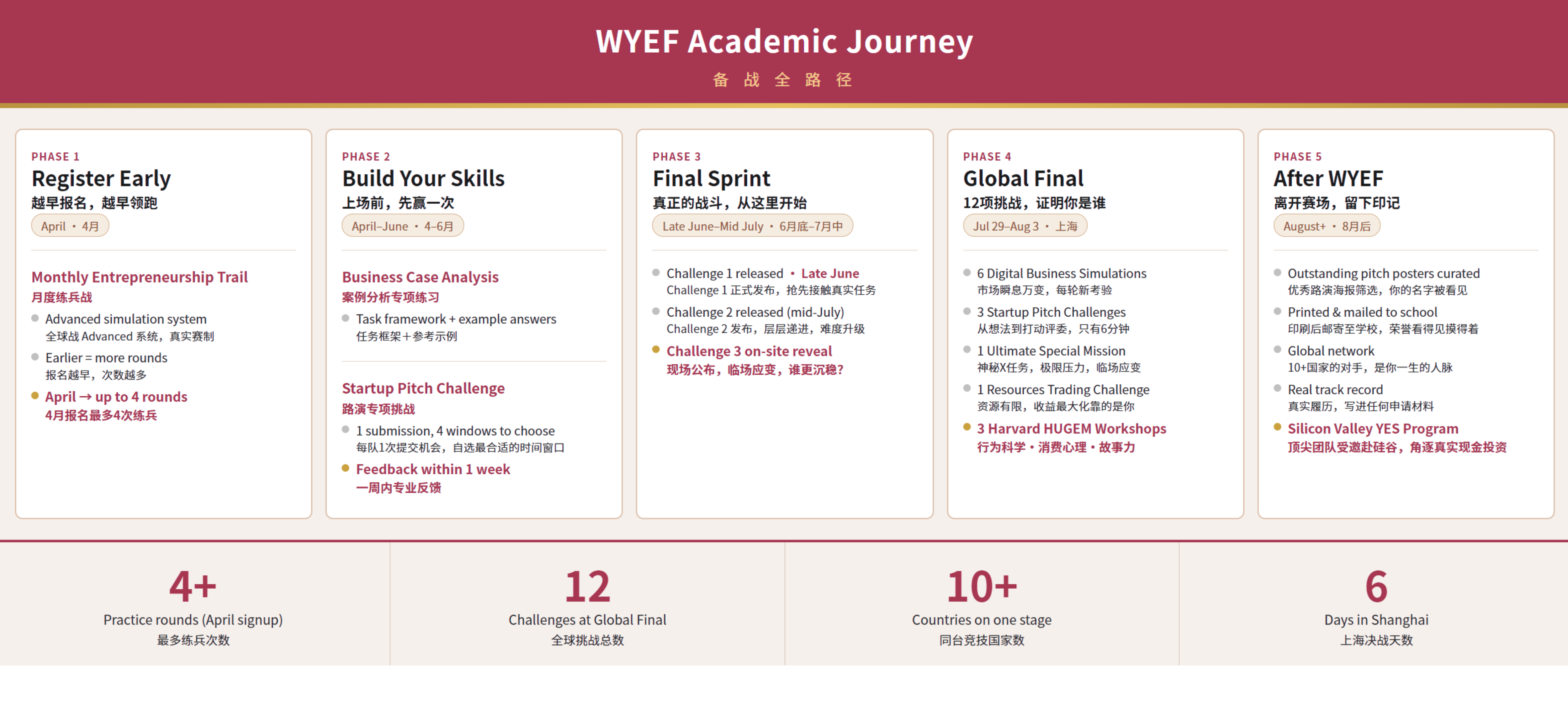 WYEF论坛每年围绕一个世界前沿的经济议题,邀请全球优秀中学生及国际学术机构、世界各校代表和商界精英研讨辩论,被誉为“中学生的达沃斯世界经济论坛”。论坛将围绕每年主题设置阿思丹模拟商战全球半决战、阿思丹模拟商战全球总决战、耶鲁经济论坛、YIS 全球高中生模拟股票投资挑战全国挑战,邀请经济学家、商界精英分享经济领域前沿话题和未来职业发展。